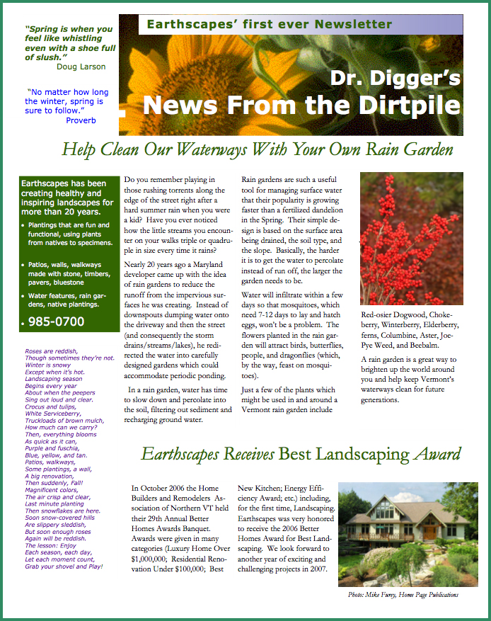 Now in our 25th year of operation, Earthscapes is locally owned by Vermonters with roots here as deep as an oak's. We are dedicated to providing practical, aesthetically pleasing, and ecologically sound solutions for any landscape. We design, install, and maintain landscapes with the utmost care and attention to detail: plantings, patios, ponds, walls, walks, windscreens.